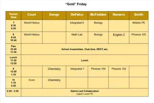 For the 2nd semester, we are making a shift in our school day start and end times to accommodate our teacher collaboration and student needs. Rather than a late start, we will be having an early release on Gold and Red Fridays. 2nd semester overview of Red and Gold Fridays is below. Calendar links for Sierra and Ghidotti can always be found on the Ghidotti website: https://ghidotti.njuhsd.com/Students--Parents/Calendar-and-Schedule-Links/index.html